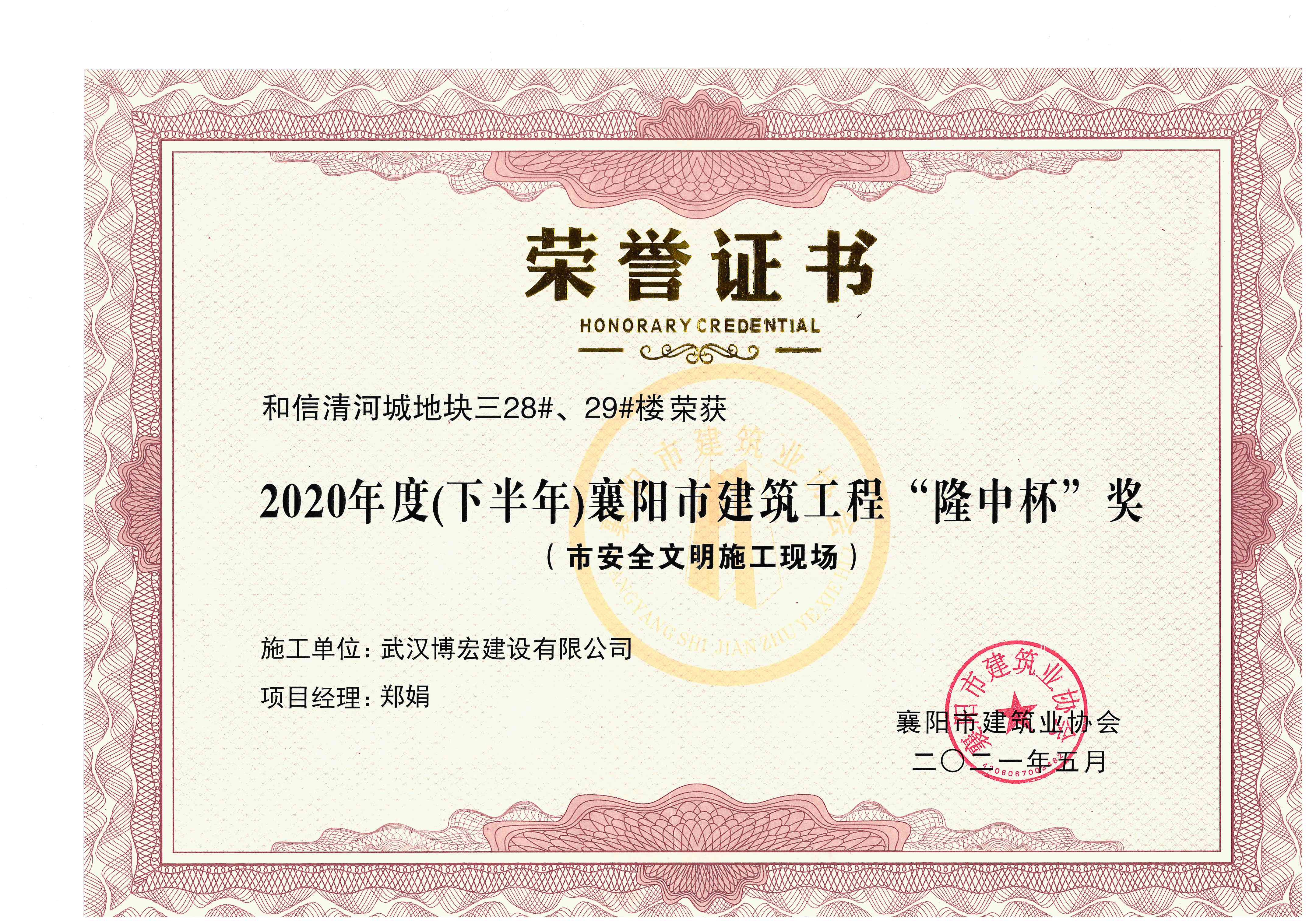 和信清河城地塊三28#、29#樓2020年度(下半年)襄陽市建筑工程“隆中杯”獎(jiǎng)(市安全文明施工現(xiàn)場(chǎng)