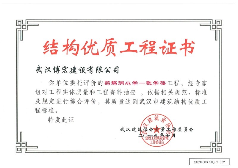 結(jié)構(gòu)優(yōu)質(zhì)工程證書(鸚鵡洲小學教學樓)