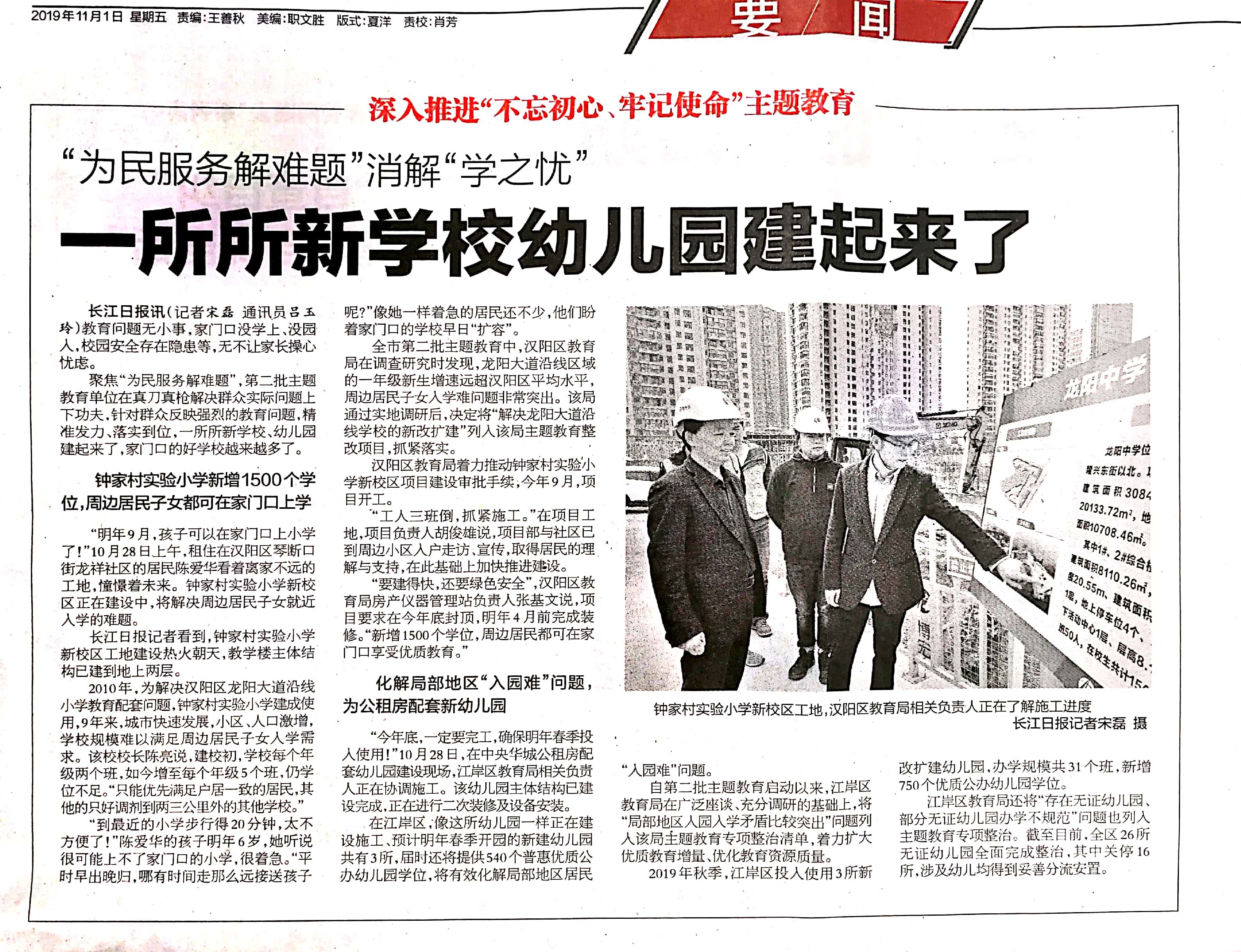 ?????????11月1日,《長江日報》以“‘為民服務(wù)解難題’消解‘學(xué)之憂’—一所所新學(xué)校幼兒園建起來了”為題,專題報道了龍陽中學(xué)項目(該項目建成后3—5年將作為鐘家村實驗小學(xué)新校區(qū)使用)的在建情況和建設(shè)意義。