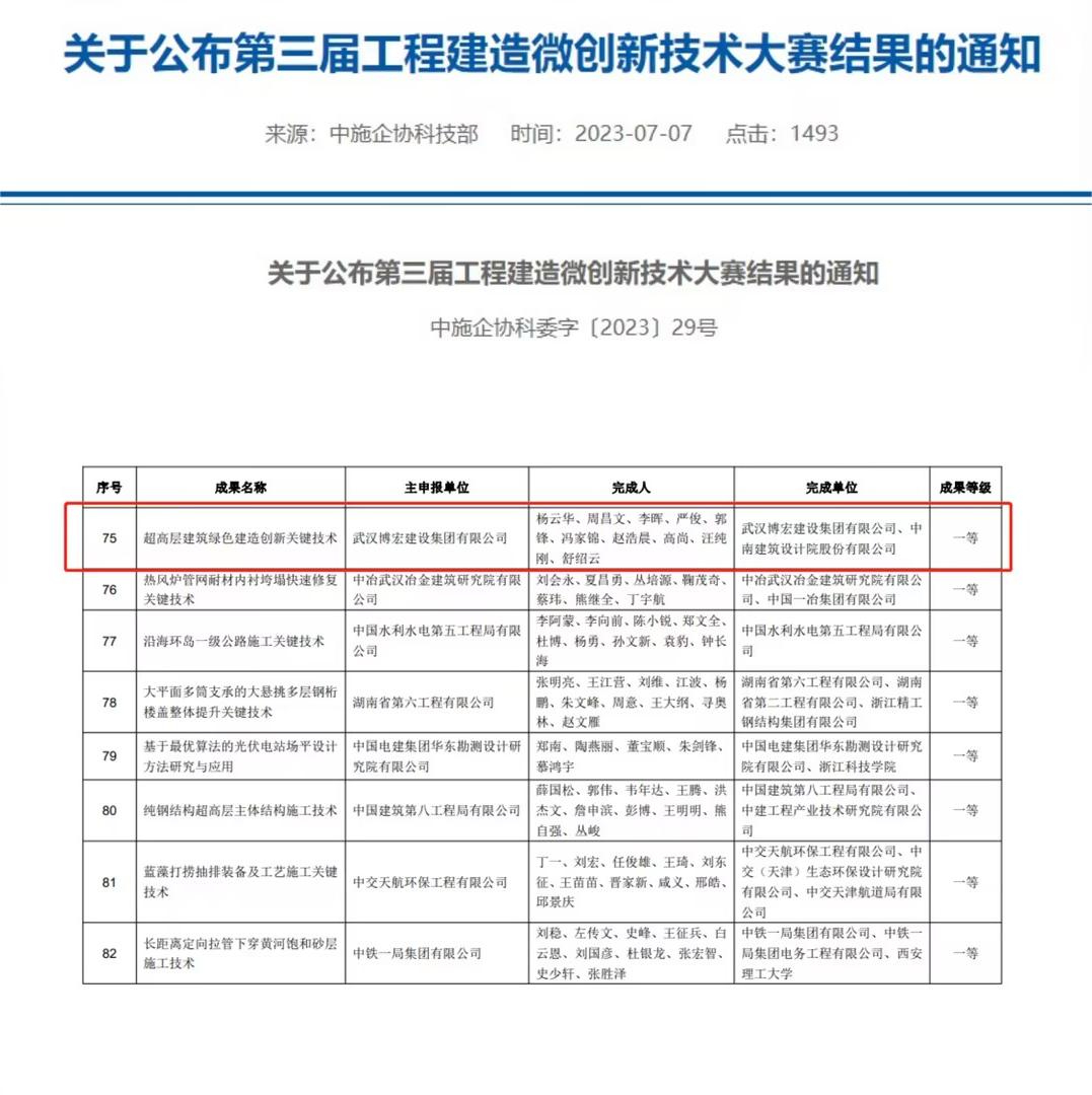 近日,中國施工企業(yè)管理協(xié)會公布第三屆工程建造微創(chuàng)新技術(shù)大賽獲獎結(jié)果。以中南科研設(shè)計中心建設(shè)項目為背景的“超高層建筑綠色建造創(chuàng)新關(guān)鍵技術(shù)”榮獲中施企協(xié)第三屆工程建造微創(chuàng)新技術(shù)大賽一等成果,這也是博宏建設(shè)集團首次獲得該類賽事一等獎。